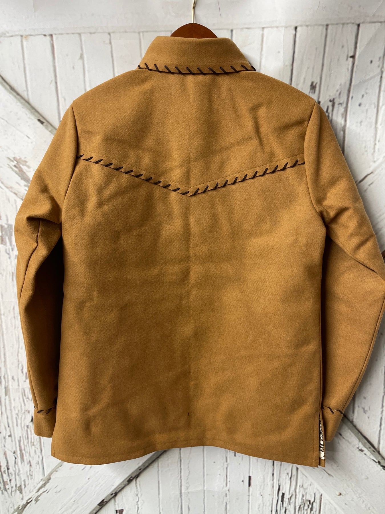 - SOLID BROWN WITH BLACK WHIP STITCH DETAILS ON COLLAR, CUFFS, POCKET, AND YOKES
