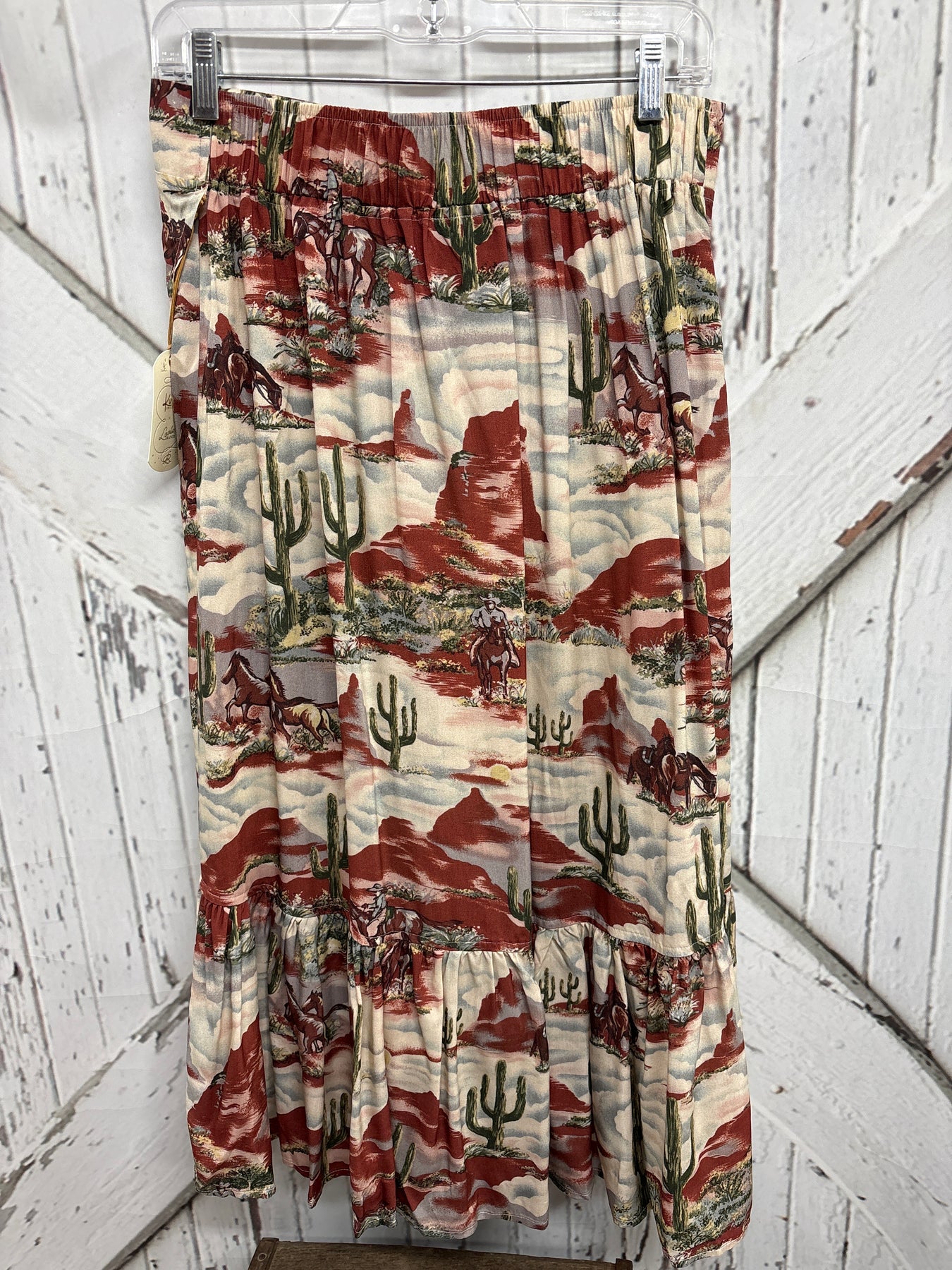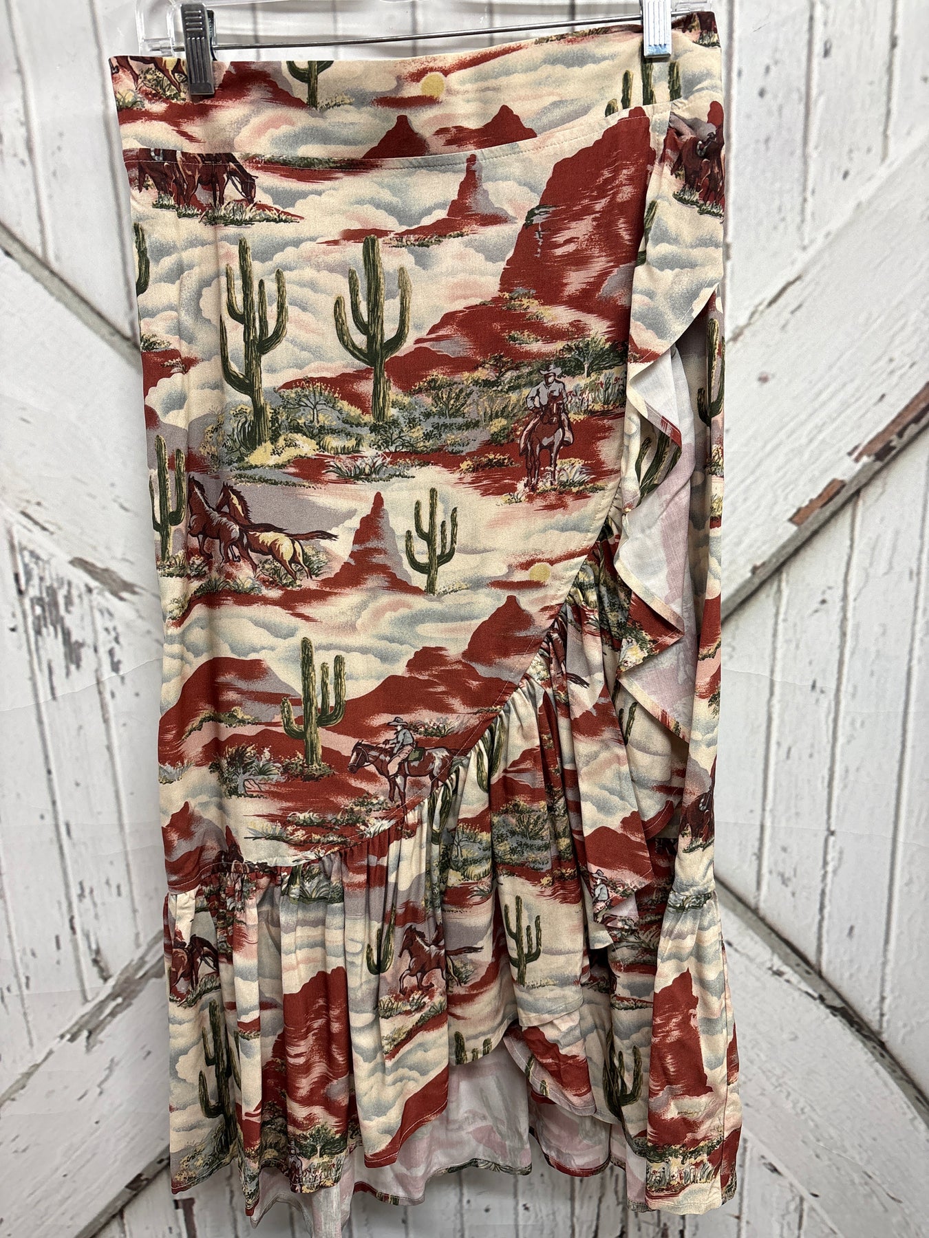 A MODERN TAKE ON CLASSIC COWGIRL CHARM, THIS FAUX WRAP SKIRT FLATTERS EVERY FIGURE WITH A SOFT RUFFLE THAT FLOWS FROM HIP TO HEM. DESIGNED WITH A FIXED FRONT AND ELASTIC BACK, IT BLENDS COMFORT AND EFFORTLESS STYLE IN BOLD, ONE-OF-A-KIND PRINTS