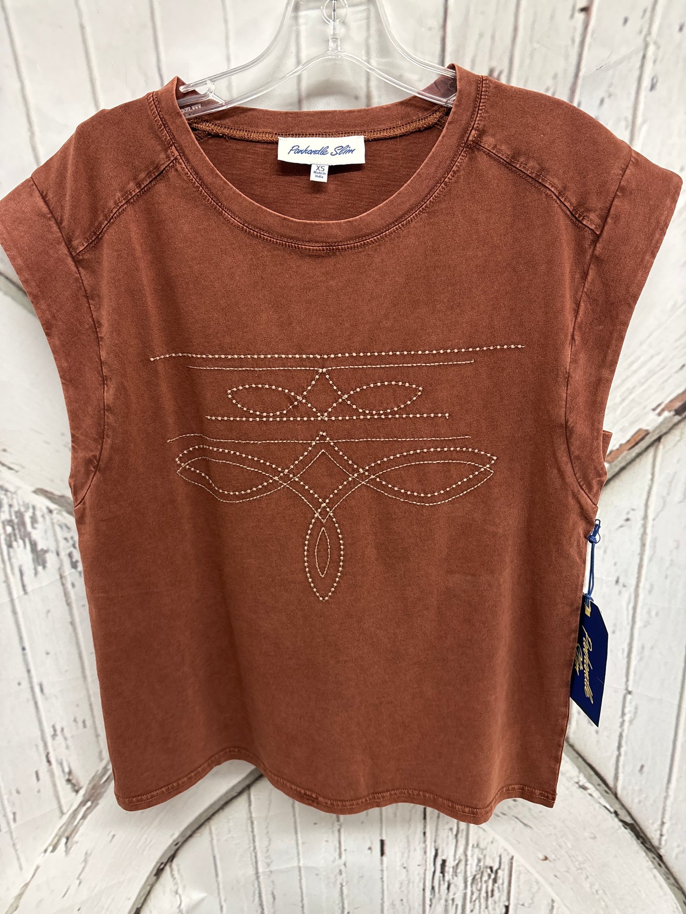 PANHANDLE SLIM BOOT STITCH EMBROIDERED JERSEY TEE IS CAREFREE AND READY FOR SUMMER IN SUPER SOFT MEDIUM-WEIGHT COTTON. THE BOXY TEE HAS A CAP SLEEVE WITH A UNIQUE, DISCREET INSERT AT THE ARMPIT FOR COMFORT AND COVERAGE.