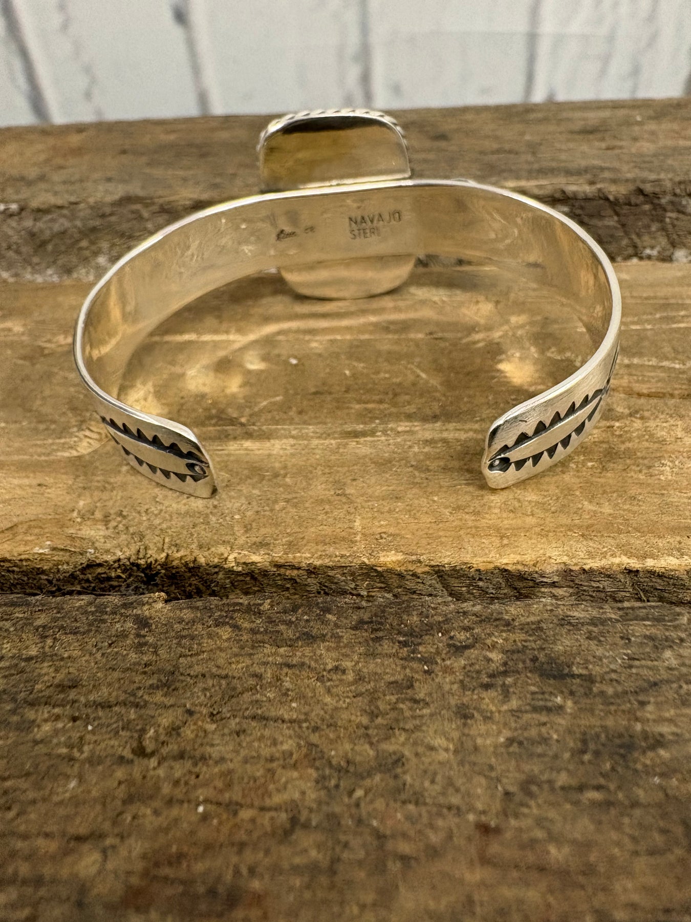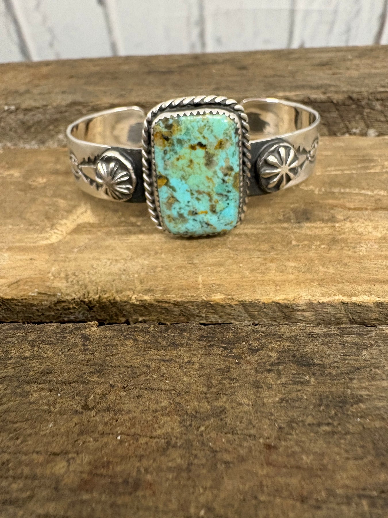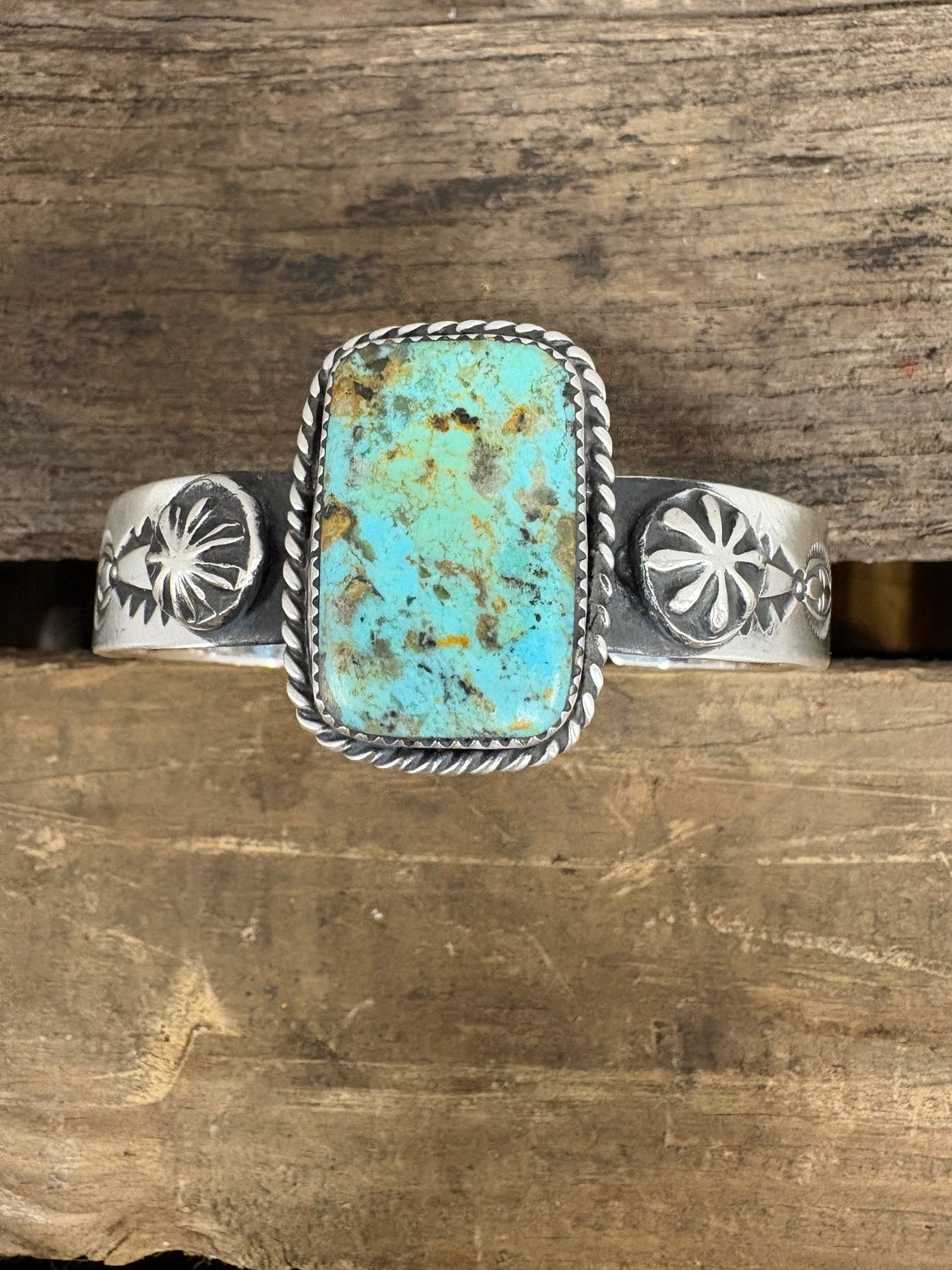 GORGEOUS NUMBER EIGHT TURQUOISE CUFF. LOTS OF DETAIL AND DESIGN ON THIS PIECE. STAMPED BY ARTIST.