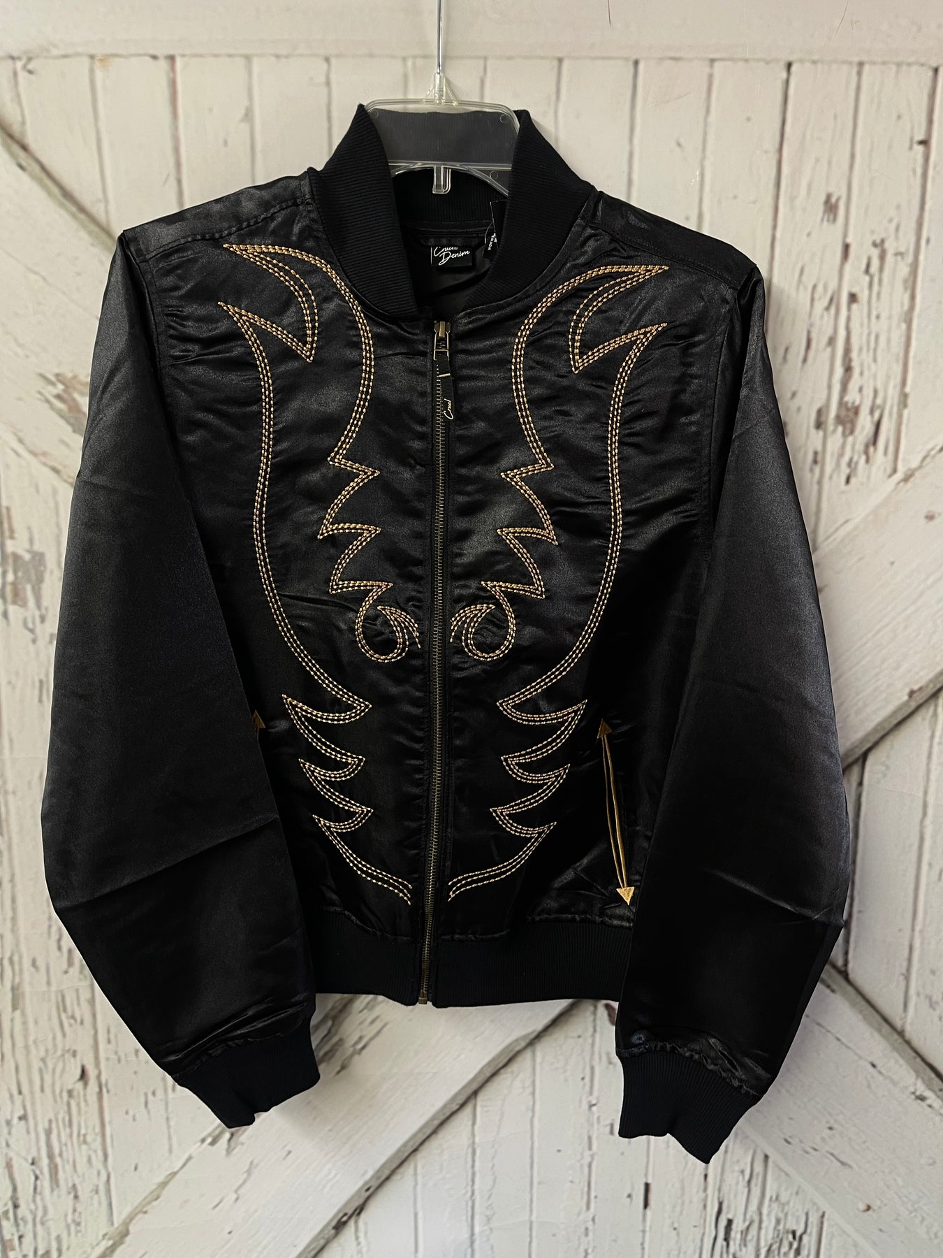 THE CRUEL WOMEN’S BOOT STITCH BOMBER JACKET IN SLEEK BLACK IS YOUR ULTIMATE STAPLE FOR AN EFFORTLESSLY CHIC LOOK. THIS JACKET IS CRAFTED TO ENHANCE YOUR SILHOUETTE, BLENDING THE CLASSIC BOMBER STYLE WITH A CONTEMPORARY FLAIR FEATURING GOLD BOOT STITCH EMBROIDERY AND SMILE POCKETS, MAKING IT PERFECT FOR SEAMLESSLY MOVING FROM DAYTIME TO EVENING WEAR. WHETHER WORN OVER CASUAL TOPS OR STYLED WITH ACCESSORIES, IT EFFORTLESSLY BOOSTS YOUR OUTFIT WITH A CONFIDENT EDGE.