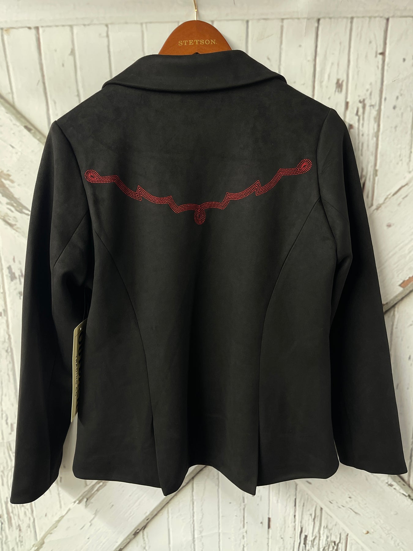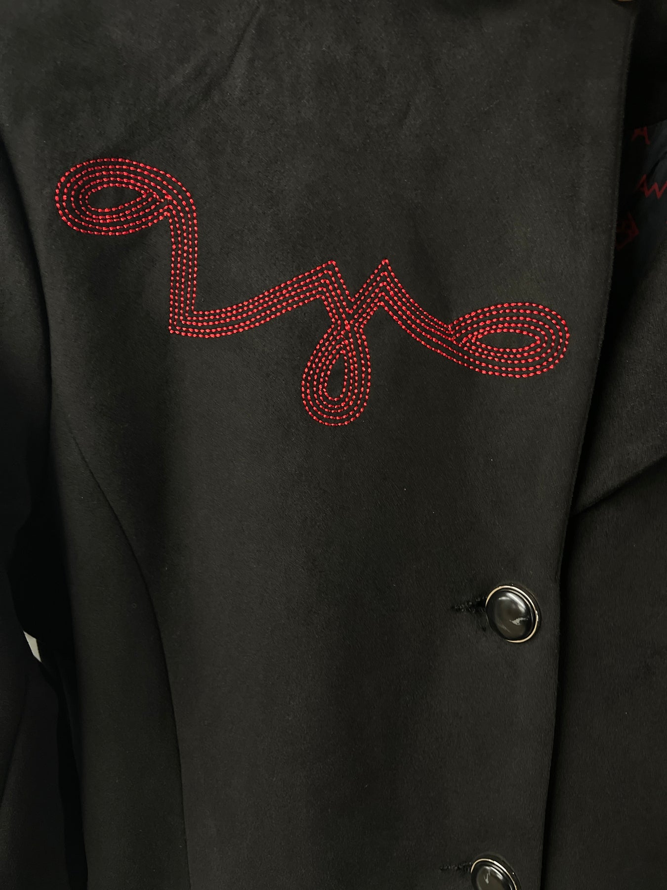 THE LORETTA JACKET IS A STRIKING WESTERN LAYER WITH BOLD RED ACCENTS ON CLASSIC BLACK. DESIGNED FOR WARMTH AND STYLE, IT’S A VERSATILE PIECE THAT STANDS OUT FROM THE ARENA TO A NIGHT OUT.